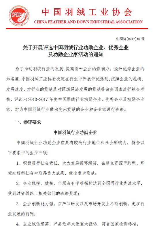 關(guān)于開展評(píng)選中國(guó)羽絨行業(yè)功勛企業(yè)、優(yōu)秀企業(yè) 及功勛企業(yè)家活動(dòng)的通知